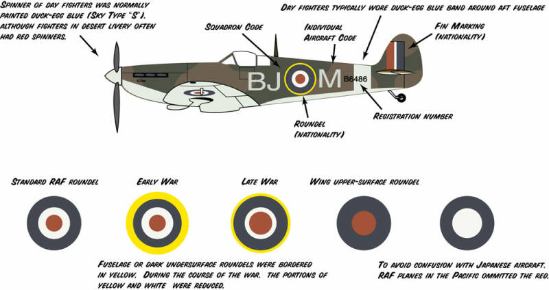 De vliegtuigen moesten natuurlijk in de lucht herkend kunnen worden. Daarom hadden de Engelsen en de Duitsers aparte kleuren en tekens.